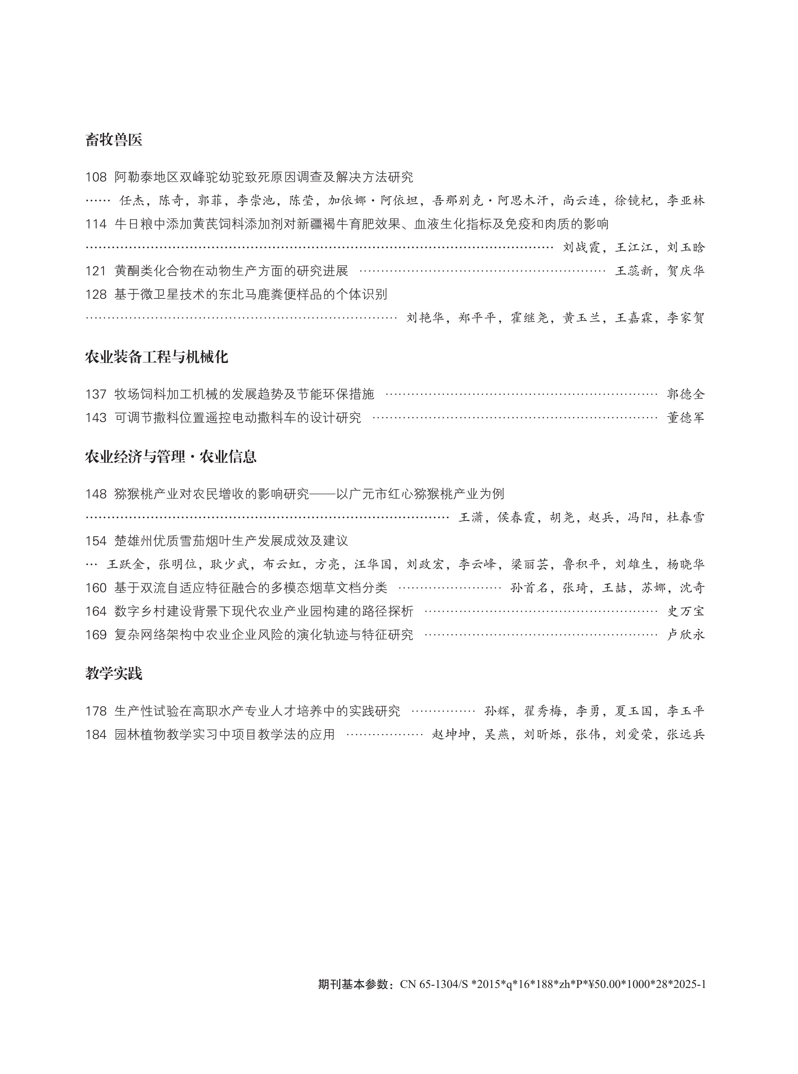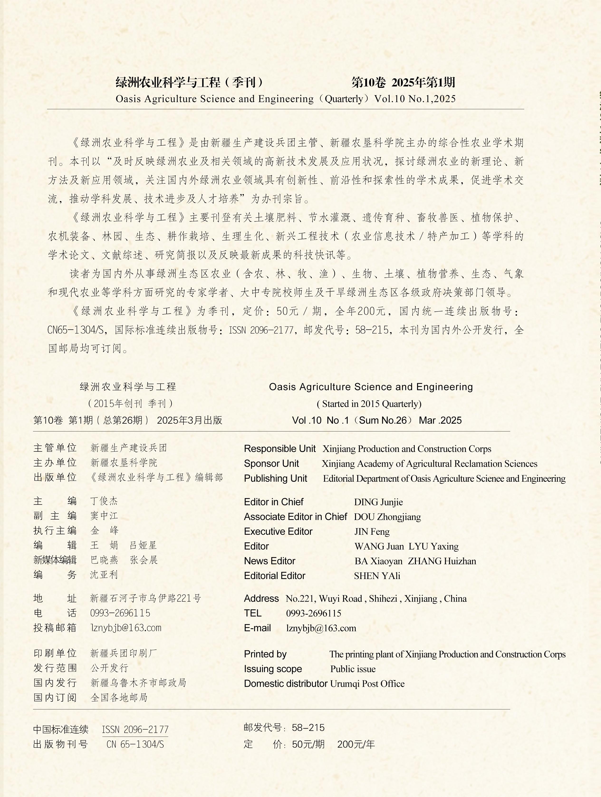 《绿洲农业科学与工程》2025年第1期目录